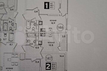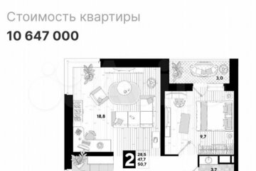 Продается 2-к квартира. Общая площадь 50.6 м2, жилая площадь 28 м2, площадь кухни 10.5 м2. 14 этаж 17-этажного дома, монолитный, постройка 2023 года. Совмещенный санузел, есть балкон, требует ремонта.